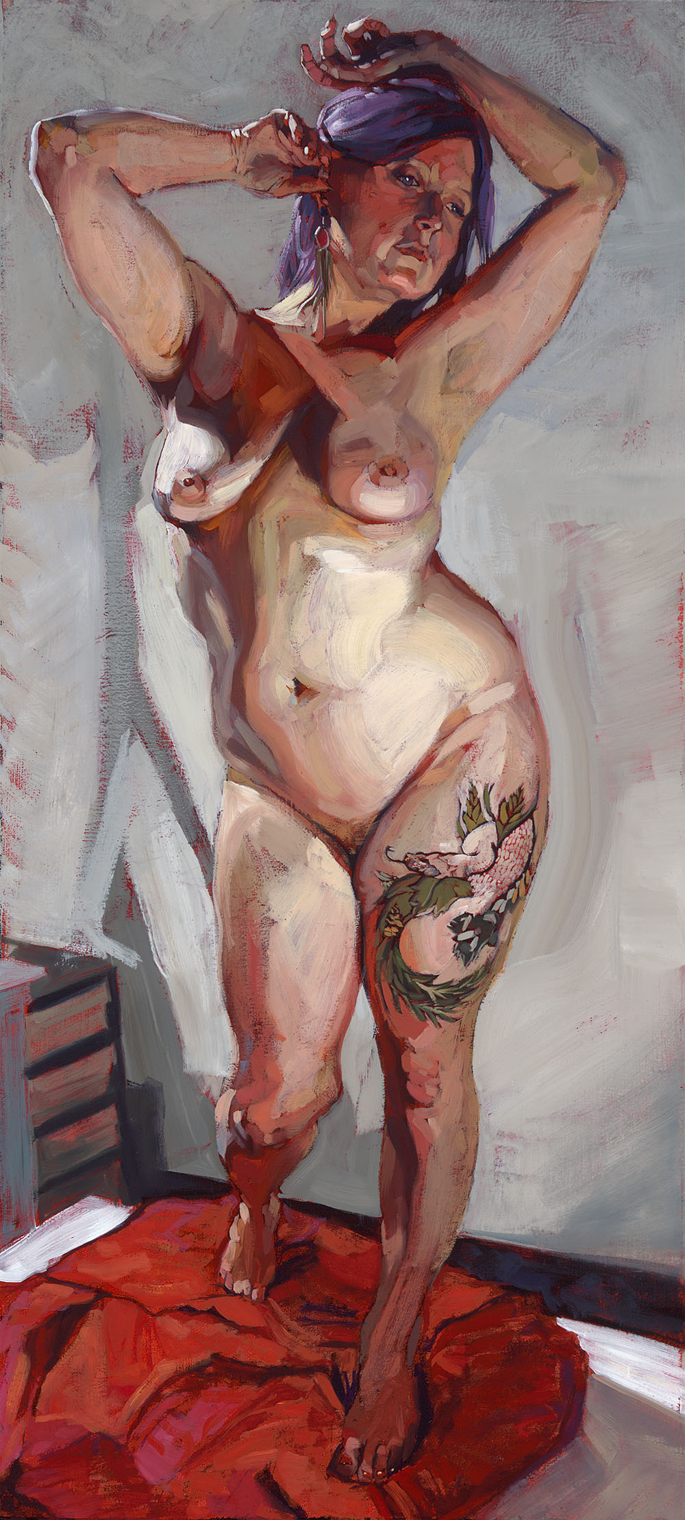 Oil painter Carla Paine‘s effortless and subtle brushwork adds to the delightful complexity of this mysterious painting. Paine lives and paints on a small farm located on a peninsula just north of Olympia, Washington. Her studio, an old farmhouse from the early 1900s, along with the expansive landscape offered by the property, allow her fantastic opportunities for landscaping, while her proximity to the city enables detailed work from live models. She trained at the Art Institute of Chicago, and the Florence Academy of Art in Italy.